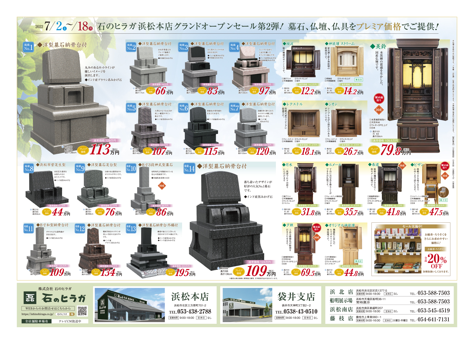 上記以外はスタッフが常駐しておりませんので、お問い合わせは「浜北店」までお問合せください。